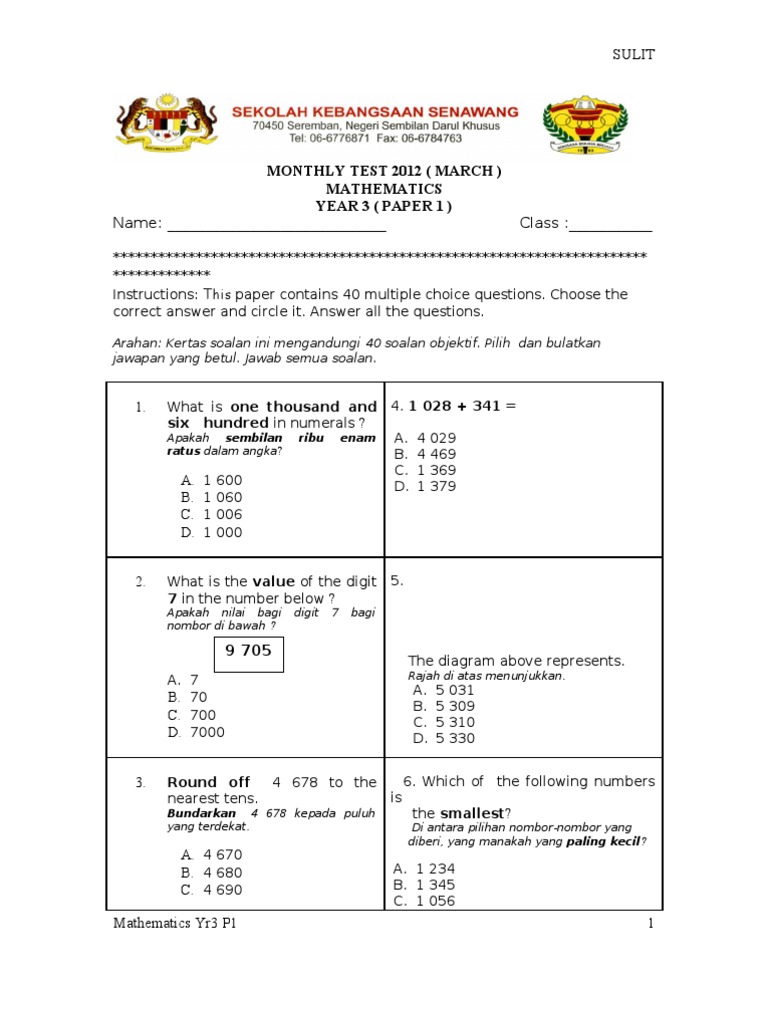 - soalan ujian bulan mac matematik tahun 3 kssr
